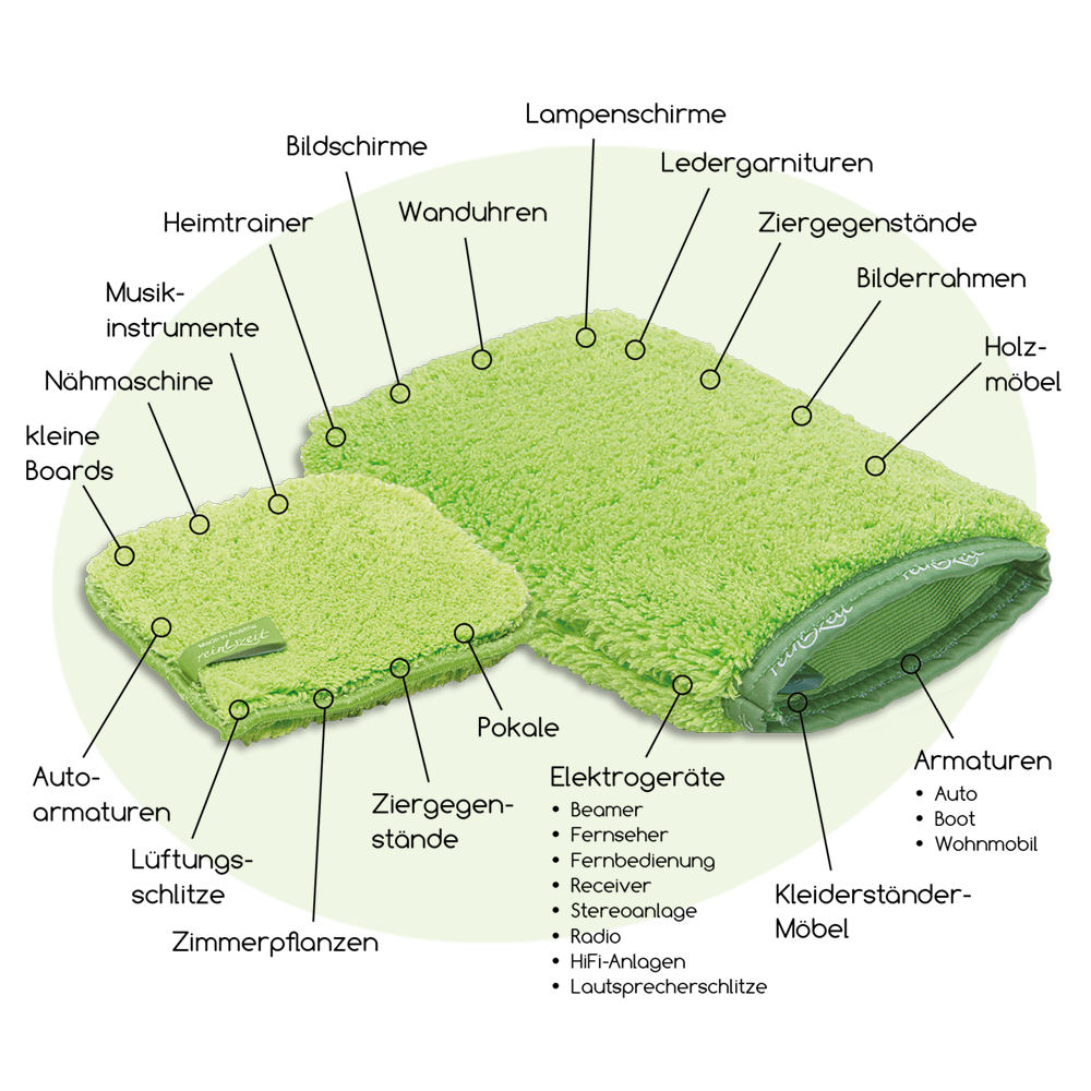 You can't make the dust go away, but with our special long pile fibre you have the dust under control. Let the glove glide over the surfaces without pressure. It removes the finest dust without stirring it up and at the same time makes fingerprints on your furniture disappear. Suitable for sensitive surfaces such as high gloss, glass and mirrors. The dust is only released again when shaking out, beating or vacuuming. For heavier soiling, wash in the washing machine at 40 °C.