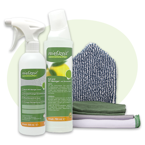 Je 1 Stück: Bad Duo-Handschuh, Badtuch, Bad & WC-Reiniger, Glas- und Spiegeltuch, Sprühflasche, Gästehandtuch-Set mit freier Farbwahl (ca. 36 x 42 cm)