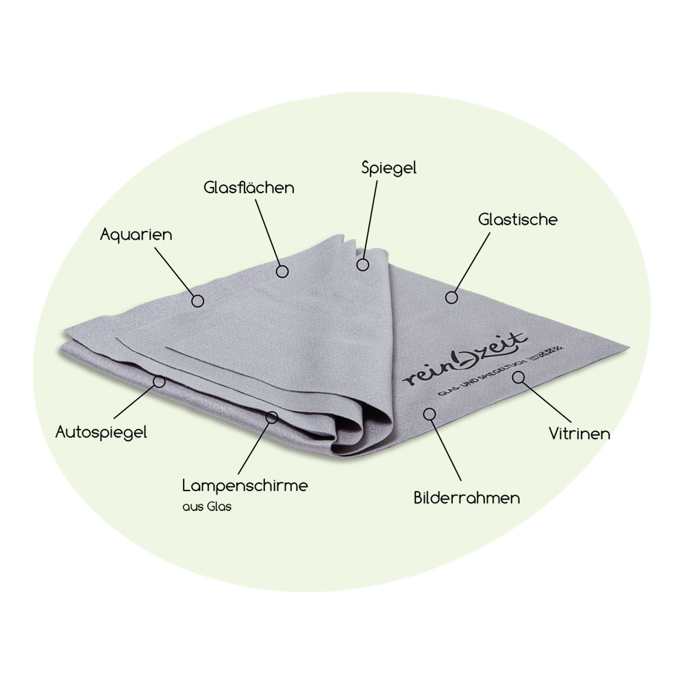 ReinZeit hat für Spiegel und Glasflächen eine ganz besondere Faser entwickelt: hauchzart, ultrafein, nahtlos und reißfest. Mit Wasser leicht angefeuchtet erlebt man glänzend saubere Wunder auf Spiegeln und Glasflächen, ganz ohne Nachtrocknen. Vorsicht: Bei grobem Schmutz ist eine Vorreinigung mit dem Multituch notwendig.