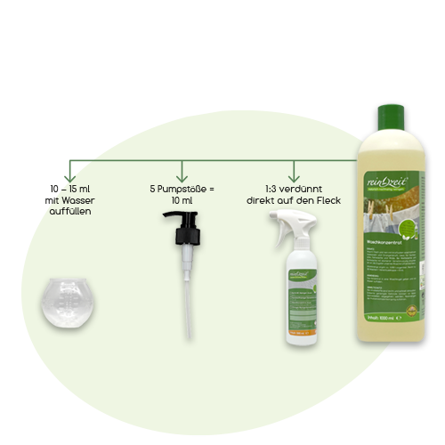 Bei Flecken verdünntes Waschkonzentrat (1:3) direkt auf den Fleck sprühen, einwirken lassen und anschließend in die Waschmaschine geben. Überdosierung verursacht einen unangenehmen Geruch in der Wäsche! Zur Waschkraftverstärkung besser mit Fleckensalz ergänzen! Waschkonzentrat in die Waschkugel geben (Zubehör-Set gleich mitbestellen!) und mit Wasser auffüllen - direkt in die Trommel zur Wäsche!